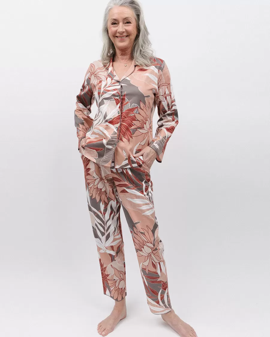 Elevate Your Sleepwear Collection To New Heights With Our Stunning Taupe Base Pyjama Set With A Captivating Palm Leaf Design In Light Pink And Red. This Exquisite Set Combines Comfort, Style, And A Touch Of Tropical Charm To Enhance Your Bedtime Routine.Crafted From High-Quality Materials, Our Pyjama Set Ensures A Comfortable And Soft Feel Against Your Skin. The Fabric Is Made Of Gentle And Breathable 60% Cotton, 40% Modal, Allowing For A Restful And Cosy Night’S Sleep And The Delicate Lace Trim, And Its Other Thoughtful Features Make This Set A Must-Have Addition To Your Sleepwear Collectionwith Its Long Sleeves And Revere Collar, The Pyjama Top Exudes A Classic And Refined Charm. The Shell Buttons Further Enhance The Elegance Of The Set, Providing A Timeless And Tasteful Touch.The Elasticated Waistband And A Drawstring On The Pyjama Bottoms Allows The Set To Adapt To Your Body Shape And The Inclusion Of Two Side Pockets Adds Functionality, Providing A Convenient Place To Keep Small Essentials Within Reach.Embrace The Versatility Of Our Evette Palm Leaf Set, As It Effortlessly Transitions From Bedtime To Lazy Mornings. Whether You’Re Lounging At Home Or Enjoying A Leisurely Breakfast, This Set Is The Perfect Combination Of Style And Comfort.
