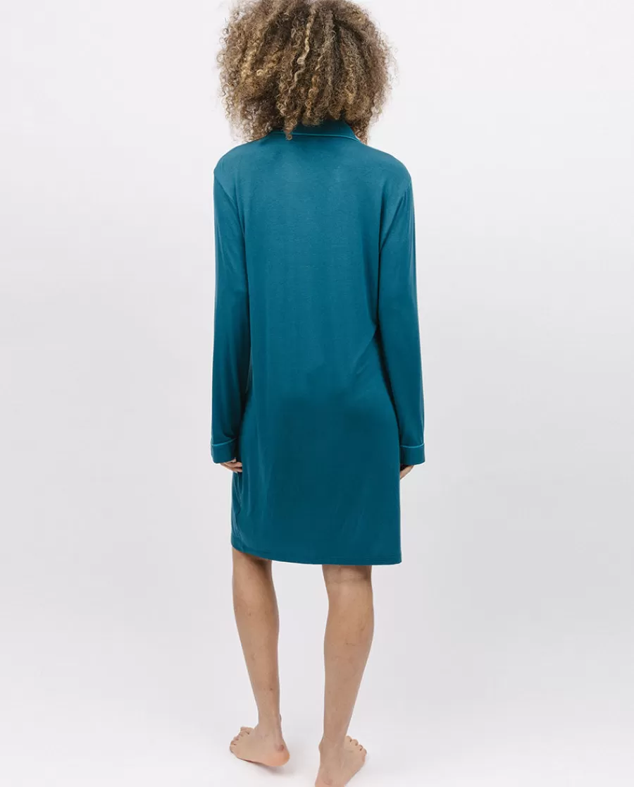 Embrace Pure Luxury With Our Exquisite Teal Jersey Nightshirt. Crafted With Utmost Care, This Nightshirt Is Made From A Sumptuously Soft Blend Of 95% Modal And 5% Elastane, Ensuring A Luxuriously Smooth And Gentle Touch Against Your Skin. The Light Teal Modal Trims Add A Tasteful And Elegant Accent, Enhancing The Overall Aesthetic.Featuring A Classic Revere Collar And Long Sleeves, This Nightshirt Exudes Timeless Sophistication. The Addition Of A Single Pocket Adds Both Practicality And Charm. The Front Fastens Effortlessly With Delicate Light Teal Modal Covered Buttons, Allowing For Easy Wear And Removal.Whether You’Re Lounging Around The House Or Settling In For A Peaceful Night’S Sleep, Our Teal Jersey Nightshirt Form The Maple Collection Is The Perfect Choice For Those Seeking Comfort, Style, And Versatility.